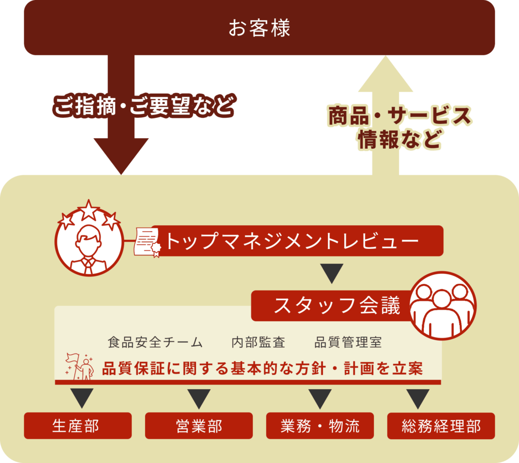 お客様のご意見・ご要望は品質管理室、スタッフ会議の解析を基本としながら、危害分析、法令法規違反等重大なトラブルにつながるものについては、迅速に対応を行っていきます。